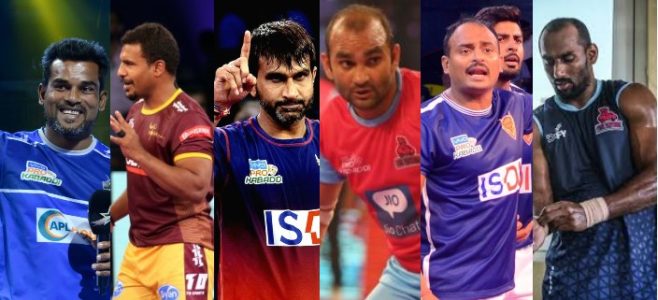 1. धर्मराज चेरलातन – अन्ना के नाम से जाने जानेवाले धर्मराज 45 साल के हैं। अन्ना अभी भी उस उम्र में मैट पर खेल रहे हैं जब कई खिलाड़ी मैट छोड़कर कोच बन जाते हैं । प्रो कबड्डी लीगमें सबसे ज्यादा उम्रवाले खिलाड़ी होने के बावजूद, अन्ना की फिटनेस देखकर कई युवा खिलाडी प्रेरीत होते है। अन्ना भारत के लिए भी खेल चुके हैं। उन्होंने 1999 और 2010 के दक्षिण एशियाई खेलों में भारत के लिए स्वर्ण पदक जीते हैं। भारत ने अहमदाबाद में 2016 कबड्डी विश्व कप जीता उसमे अन्ना विजेता टीम के सदस्य थे। वह भारत में घरेलू प्रतियोगिताओं में भारतीय रेलवे के लिए खेलते हैं। उनके नेतृत्व में, भारतीय रेलवे ने 66 वीं सीनियर नेशनल कबड्डी चैंपियनशिप में स्वर्ण पदक जीता। वह इस साल मार्च में आयोजित 67 वीं सीनियर नेशनल कबड्डी चैंपियनशिप में रेलवे की विजेता टीम के सदस्य भी थे।