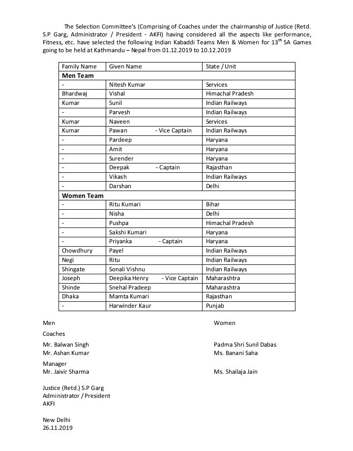 दक्षिण एशियाई गेम्स के लिऐ कबड्डी टीम इंडिया का चयन। दीपक हुड्डा, प्रियांका के पास कप्तानी